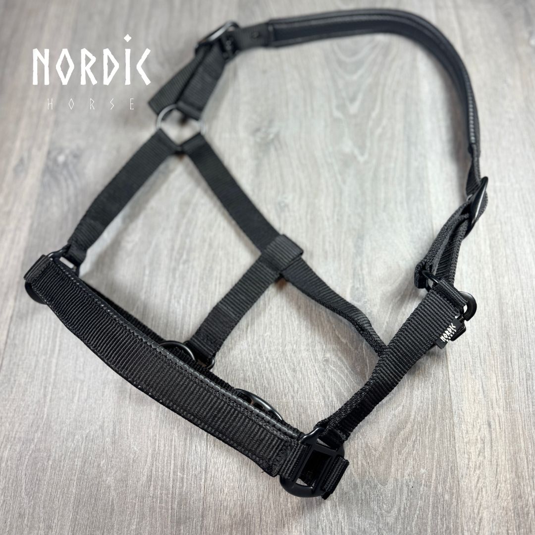 Sort nylon grime med sorte spænder. Nakke og næsestykket er med sort neopren foring der har let anti glidende effekt